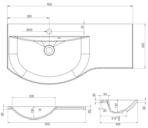 Modernilinjainen Dali valumarmoriallas 90 900x320/435x30mm, allas vasemmalla. Kestävä evermite pinnoite. Sopii 280-295mm runkosyvyydelle. Altaan tason korkeus 30mm, pakkaus sisältää kiinteän vesilukon (Preloc 120) ja kromitulpan. Etulevy tilattava erikseen.
