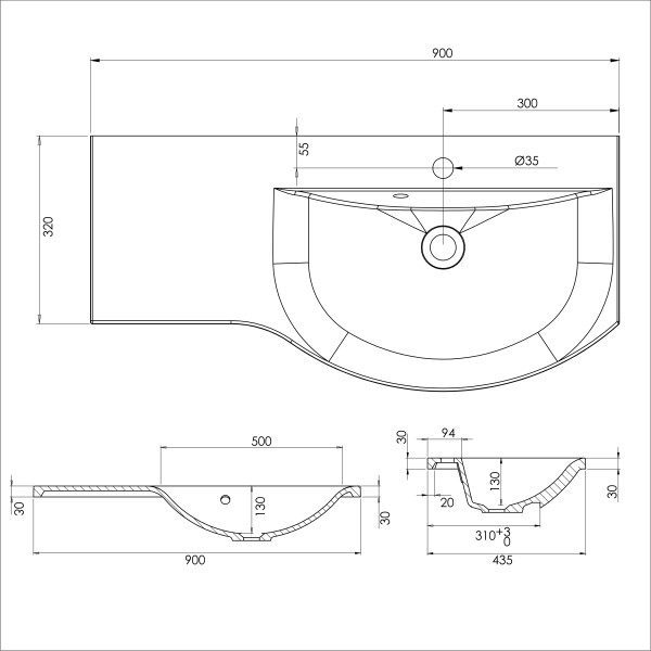 Modernilinjainen Dali valumarmoriallas 90 900×320/435x30mm, allas oikealla. Kestävä evermite pinnoite. Sopii 280-295mm runkosyvyydelle. Altaan tason korkeus 30mm, pakkaus sisältää kiinteän vesilukon (Preloc 120) ja kromitulpan.